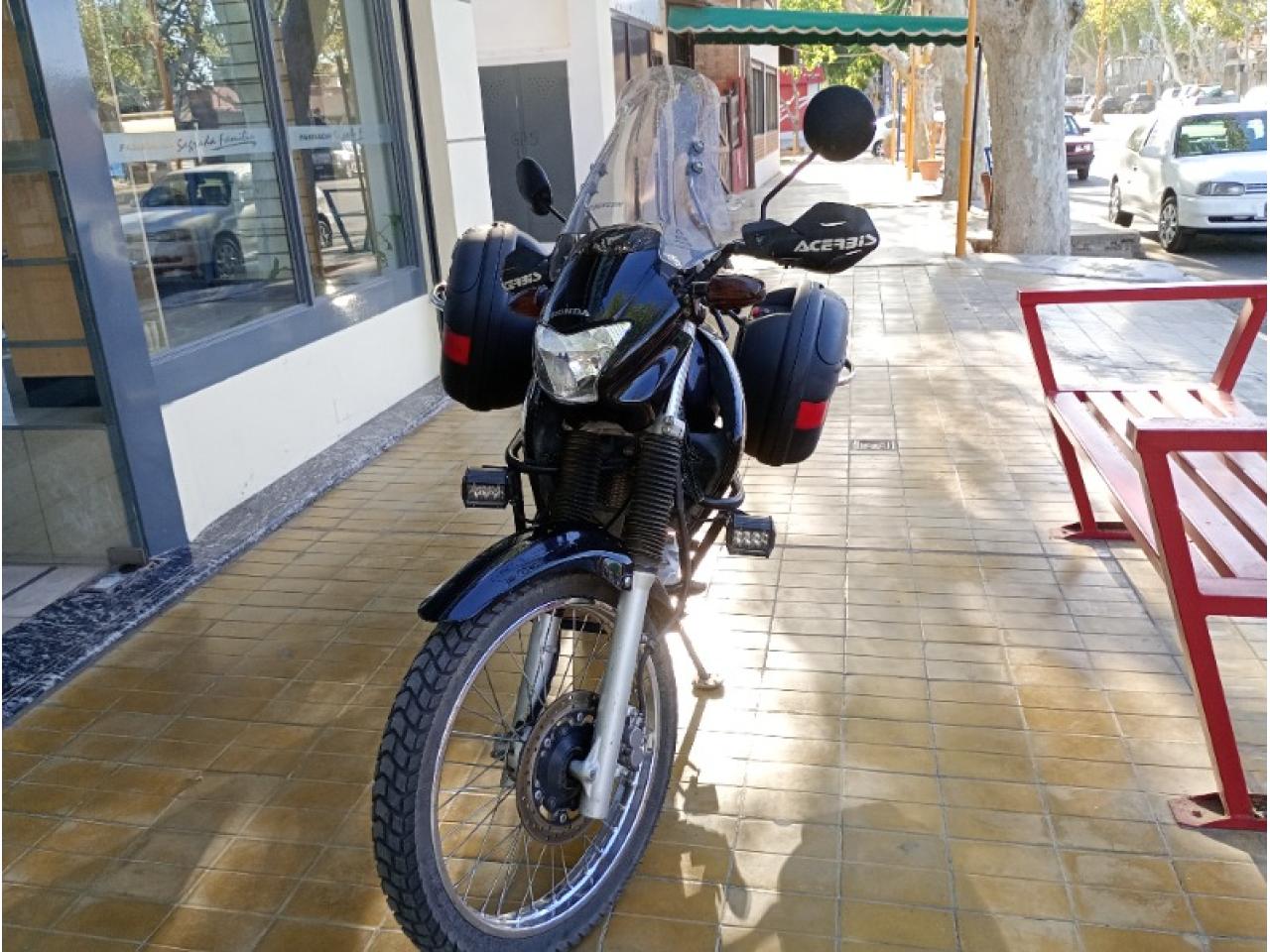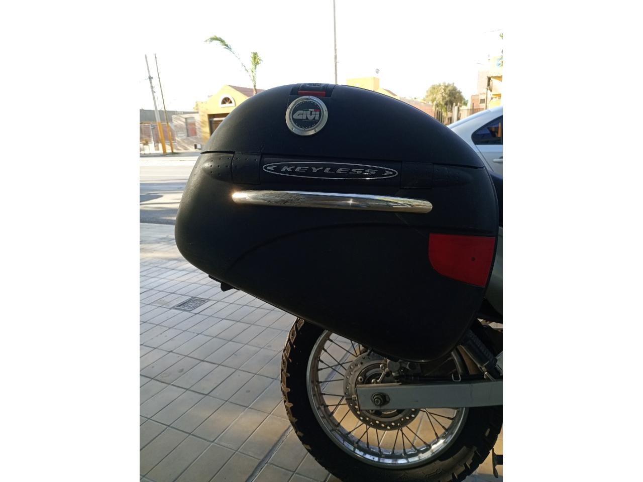 Equipamiento:Inmejorable, cubiertas nuevas, cámaras 4 mm servicio completo realizado,trasmisión nueva( cadena, piñón y corona)caballete central, luces auxiliares luces auxilares, porta equipaje, porta alforjas, salida a 12 volt, cubre carter, cubre puño, alarma x 28, defensas laterales, funda asiento,fuelles en suspensión, falso escape, ampliador de muleta, parabrisas, manueles,herramientas originales, duplicado de llaves valijas laterales Givi