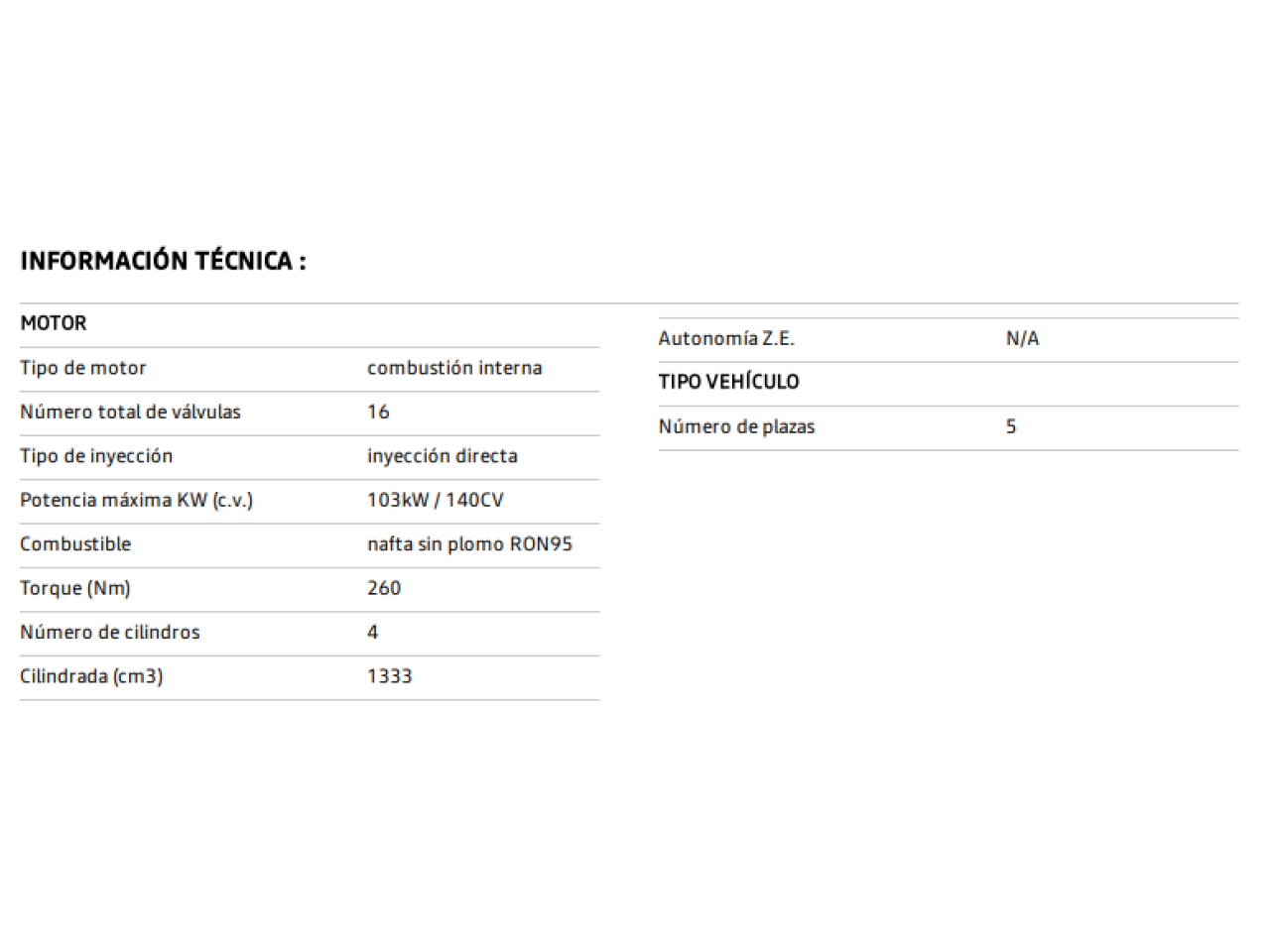 Equipamiento:ESPECIFICACIONES TÉCNICAS: potencia del motor principal: 103kW / 140CV tipo de gas refrigerante 1234YF sistema de propulsión micro híbrido con BSG arquitectura de software SWEET 110 caja de cambios de doble embrague húmedo EDC (DCT) de 7 velocidades cilindrada: 1333cm3 CONFORT volante calefaccionado luneta calefaccionada regulación manual de altura de los faros levantavidrios eléctricos one-touch con antipinzamiento levantavidrios delanteros eléctricos impulsionales purificador de aire selector de marcha tipo e-shifter espejos de cortesía delanteros con iluminación baúl con sistema de doble fondo limitador de velocidad + control de velocidad crucero adaptativo con "stop&go" asientos delanteros calefaccionados apoyabrazos en plazas traseras con dos espacios apoya vasos apertura y cierre remoto de puertas y ventanillas desde llave tarjeta asistente de centrado de carril (LCA) salida de aire acondicionado en las plazas traseras sensor crepuscular y de lluvia filtro de particulas indicador de cambio de marcha (GSI) aire acondicionado digital automático de una zona apertura y cierre de puertas remoto desde llave tarjeta iluminación ambiente en consola, tablero y puertas delanteras modo ECO freno de estacionamiento eléctrico con auto-hold TECNOLOGÍA: tablero de instrumentos digital de 10.2 tecnología Multi-Sense con tres modos de manejo configurables pantalla multimedia 9.3 + sonido envolvente con 9 parlantes BOSE faros adaptativos (AHL) cargador inalámbrico de smartphone woofer BOSE espejo retrovisor central electrocrómico sin marcos replicación inalámbrica de smartphone (Android Auto y Apple Car Play) cámara 360° con Around View Monitor (AVM) espejos retrovisores eléctricos abatibles con auto-fold SEGURIDAD: monitor de presión de neumáticos indirecto (TPMS) alerta de tráfico cruzado trasero (RCTA) sistema de advertencia de acercamiento lateral airbags laterales delanteros y traseros sistema antibloqueo de frenos ABS desconexión de ADAS freno autónomo de emergencia (AEBS) con detección de ciclistas y peatones asistencia de frenado de urgencia (AFU) airbag frontal conductor y pasajero desconexión de airbag pasajero recordatorio de cinturón de seguridad en todos los asientos (SBR) cinturón de seguridad de tres puntos en asiento trasero central blind spot warning (BSW) detector de fatiga del conductor asistente de mantenimiento de carril (LKA) alerta de distancia segura (DW) control de arranque en pendiente (HSA) sujetadores isofix + top tether sensores de estacinamiento delanteros, traseros y laterales