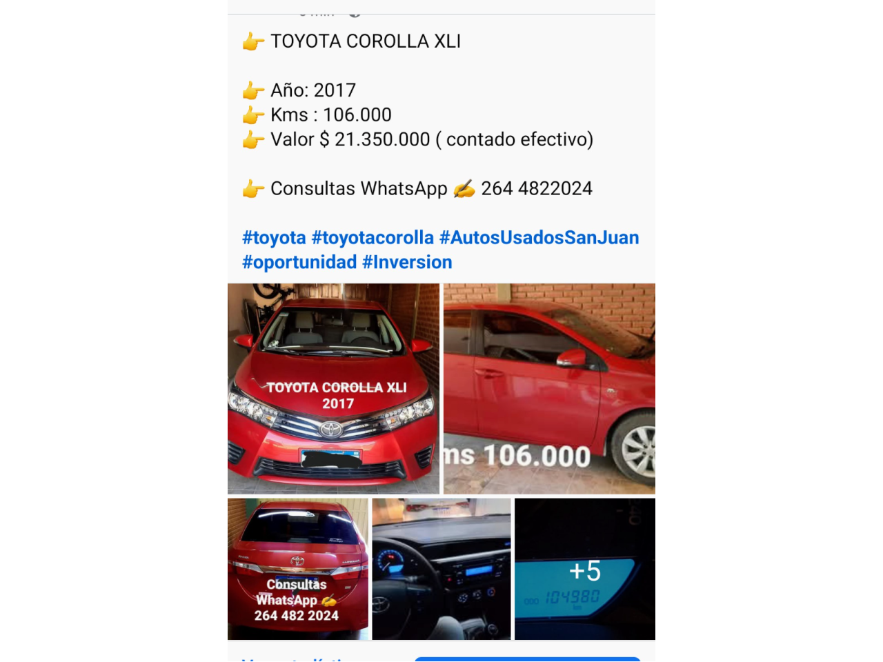 Comentario:👉 TOYOTA COROLLA XLI 👉 AÑO 2017 👉 KMS: 106.000 👉 VALOR $ 21.350.000 Contado efectivo. 👉 Consultas WhatsApp ✍️ 264 4822024