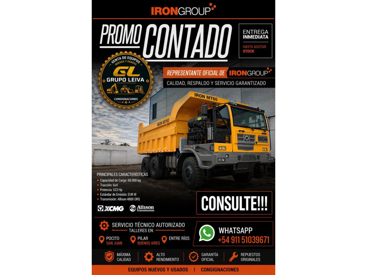 Equipamiento:POTENCIA MINERA DISPONIBLE! IRON XCMG MT60: RENDIMIENTO SIN LÍMITES Llevá tu operación al siguiente nivel con el Camión Fuera de Ruta IRON XCMG MT60, el aliado estratégico para el movimiento de suelos y minería más exigente en la zona de Cuyo. Especificaciones Técnicas de Alto Nivel: Capacidad de Carga: 60 Toneladas (Rendimiento optimizado para máximo volumen). Transmisión: ALLISON (Líder mundial en confiabilidad y suavidad de marcha). Tracción: 6x4 (Máximo agarre y estabilidad en terrenos complejos). Potencia: 523 HP (Fuerza bruta para pendientes pronunciadas y carga total).