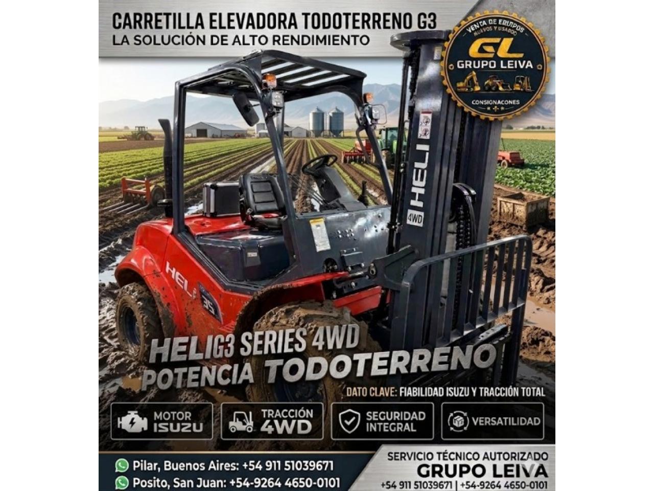 Equipamiento:¡POTENCIA PURA EN SAN JUAN! HELI G3 TRACTOELEVADOR 4X4 ¿Buscás una máquina que no se detenga ante nada? Presentamos la HELI CPCD 35 G3, el autoelevador todo terreno diseñado para los suelos más exigentes de nuestra provincia. 🔥 FICHA TÉCNICA DESTACADA: MOTOR: ISUZU POTENCIADO 4JG2 (Confiabilidad y fuerza extrema). CAPACIDAD: 3.500 kg (3.5 Toneladas). TRACCIÓN: 4X4 Real para barro, arena y ripio. MÁSTILES: Configurables según tu necesidad: Doble: 3.700 / 4.000 mm. Triple: 4.500 / 4.700 / 4.800 / 6.000 mm. COMBUSTIÓN: Diesel de bajo consumo.